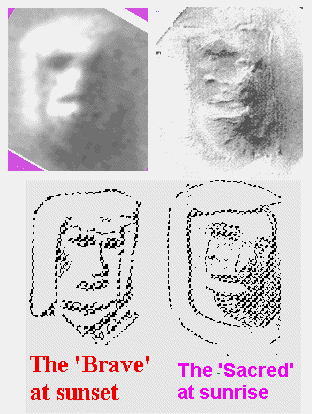 5) Dr. Lahoz published monograph: "Sacred Martian Face = Sagrada Faz Marciana" (UNIAM, dec-2000) explaining in every detail the riddle of the Face, but, unaware of Ignatius' publication, he said in there that Dr. Van Flandern had firstly announced 'conclusive evidence' of Fine-Art (artificiality) in the Face. Now such priority case is here corrected; and the work of Kelly-Fleming-Van Flandern remains moderately respected since the negative was used anyway, even for the wrong purpose of pretending a SYMMETRIC Face-Mesa. Such symmetry is not there as already explained. 6) Dr. Lahoz gave artistic interpretation of both intended Art-Faces (sunset and sunrise respectively). Above picture does not need more comments. There is, conclusively, extraordinary Fine-Art and Craft in the Face-mesa. |